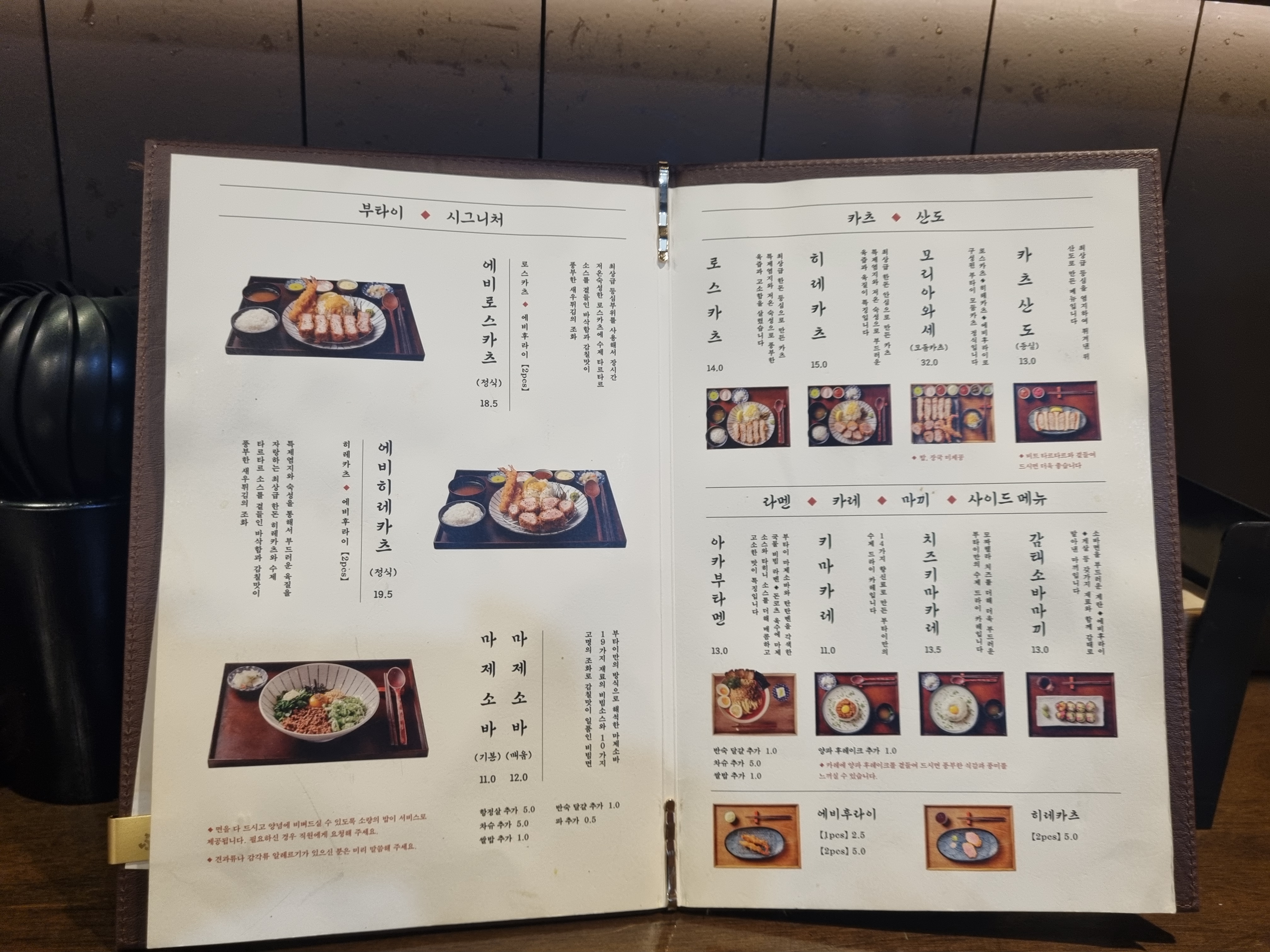 여긴 돈까스, 마제소바, 카레, 가츠산도, 마끼까지 메뉴가 다양해.