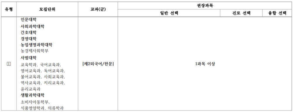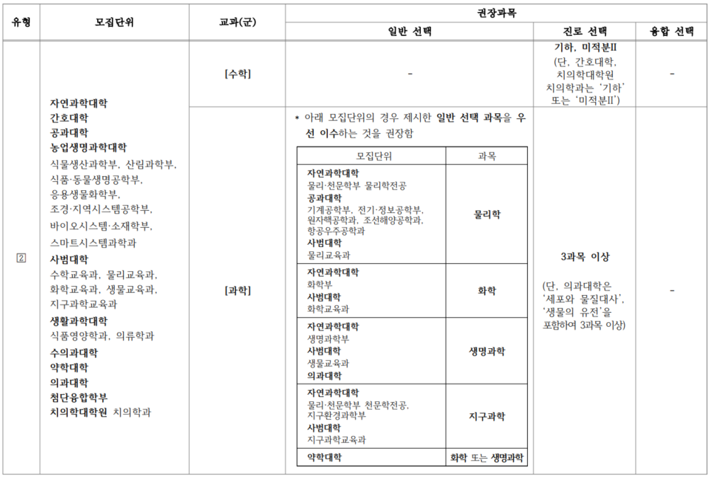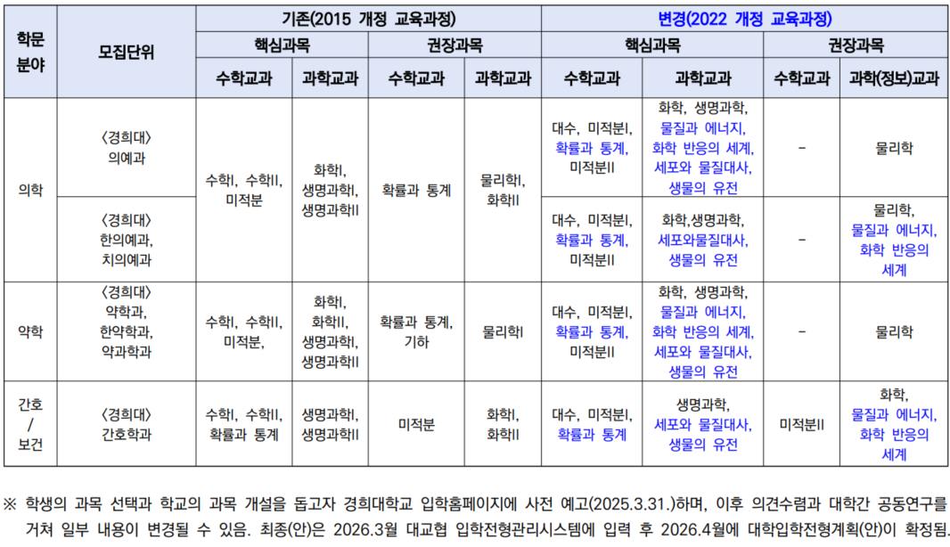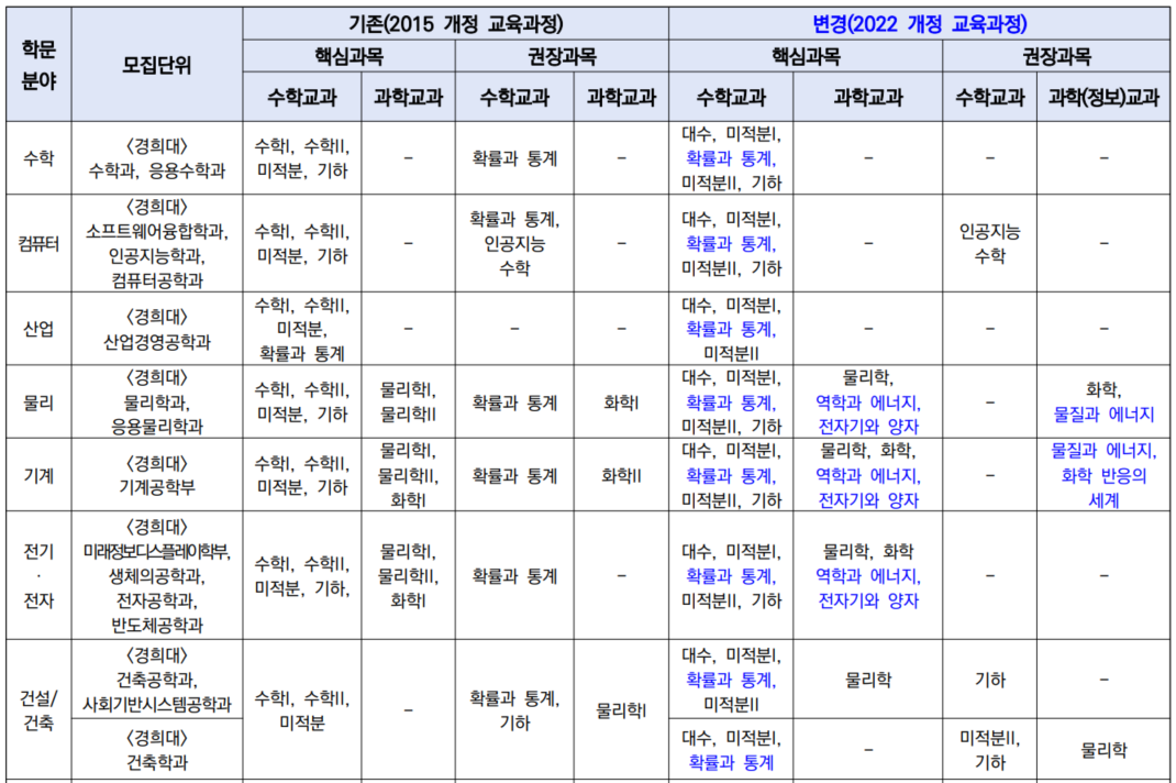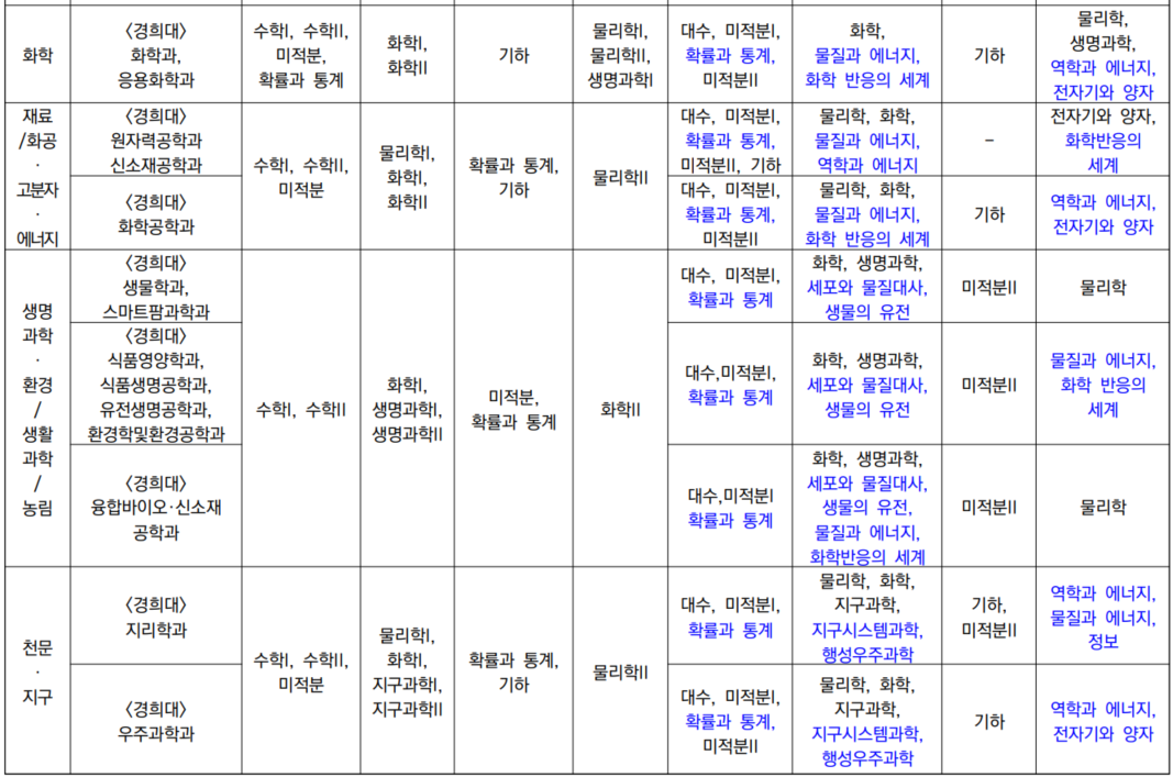 경희대학교 「2028 자연계열 학문분야의 고등학교 교과 이수 권장과목」